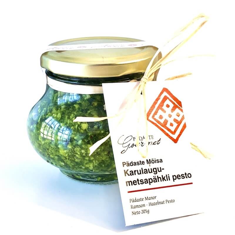 Pädaste Karulaugu-metsapähkli pesto on valmistatud mõisa aias kasvavast maitsvast karulaugust. Mõnus röstsaia viilule määrida ja värske keedukartuli, pasta või riisiga segada. Sobib ka omleti, kala või liha juurde maitsekomponendina nii enne, kui pärast küpsetamist.