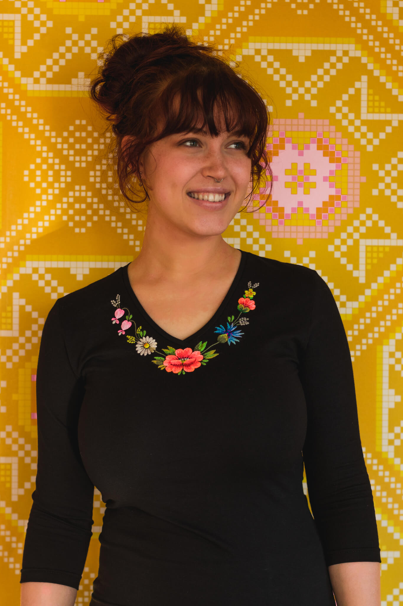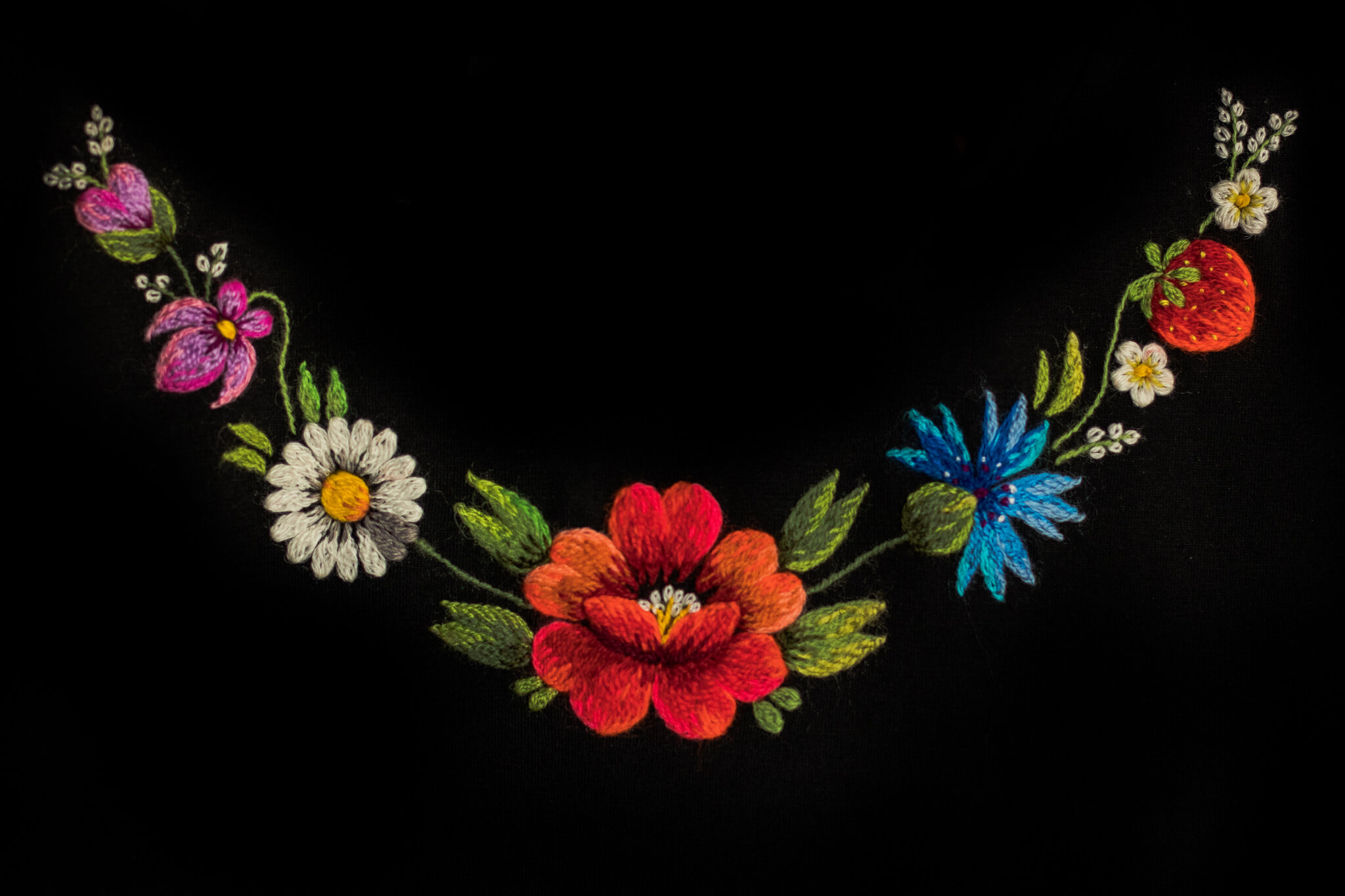 Pluusid on valminud käsitööna ja kaunistatud traditsioonilise Muhu tikandiga